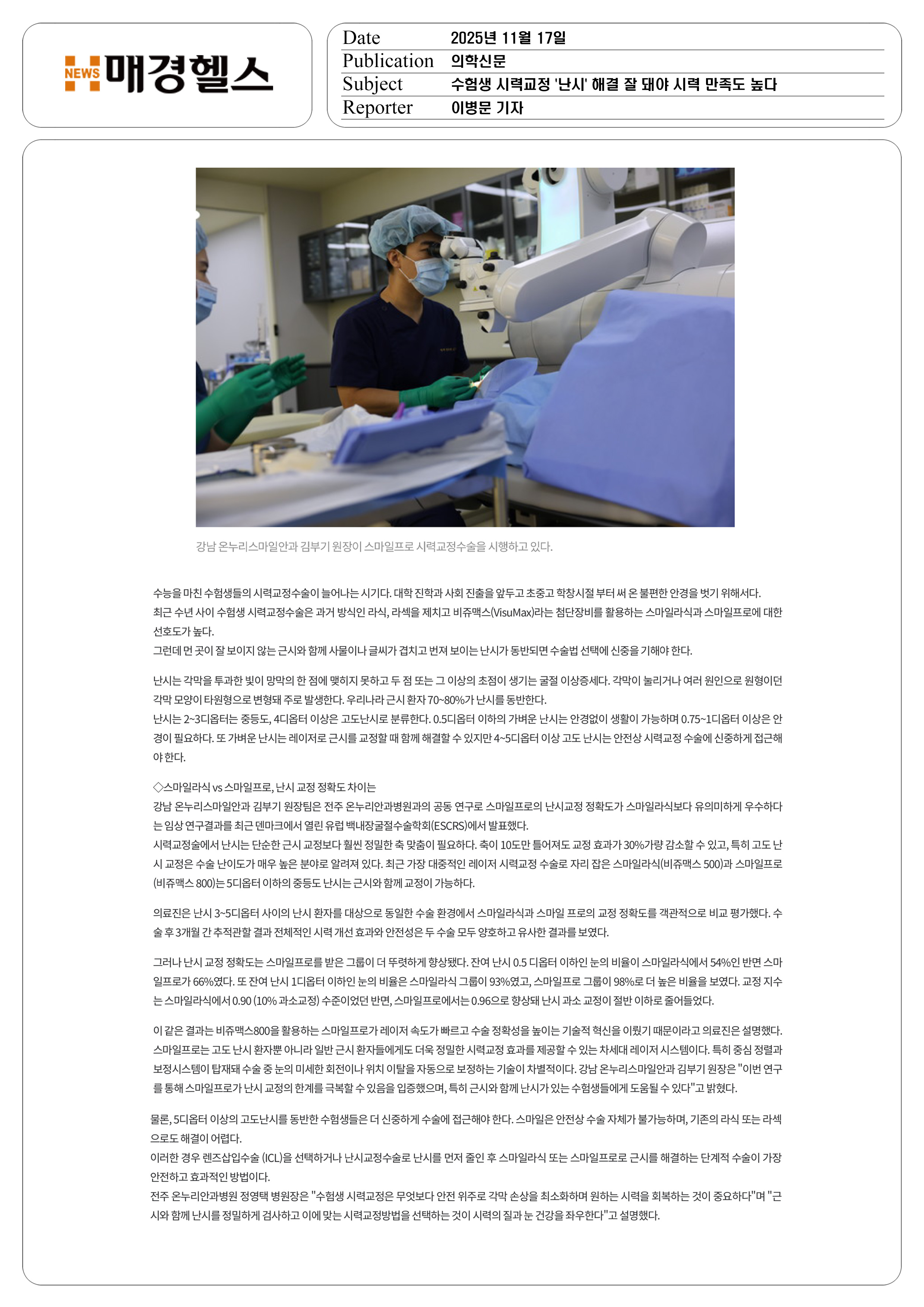 수험생 시력교정 "난시"해결 잘 돼야 시력만족도 높다